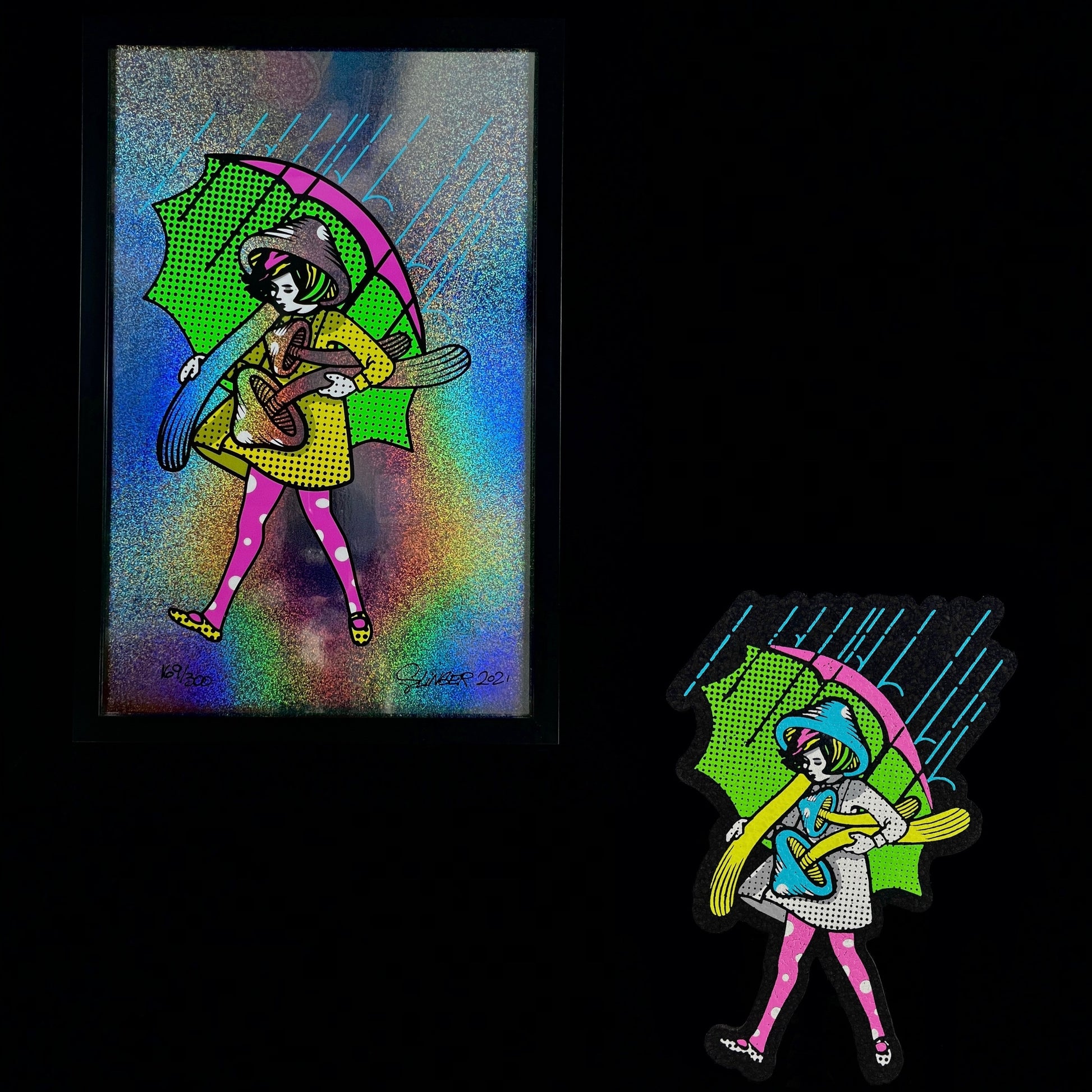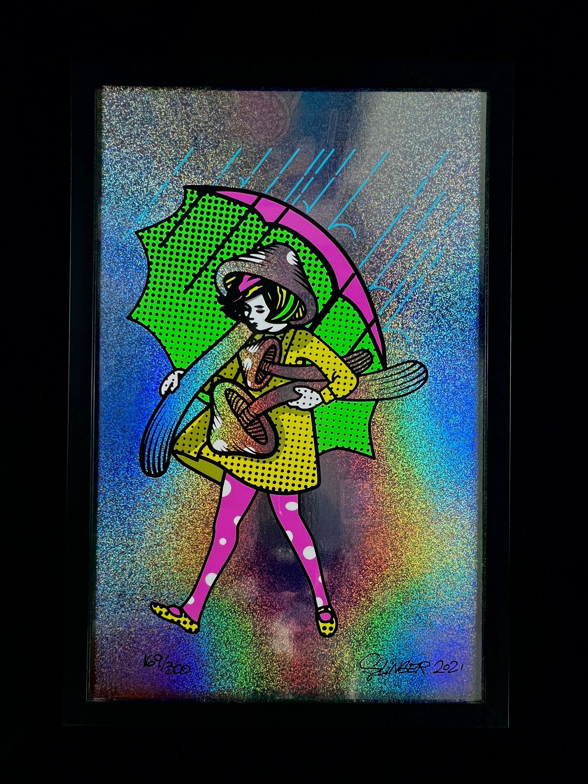 Print is 7 color / hand-screened ink on Rainbow Holographic paper 12pt. 11” x 17”. Frame included.